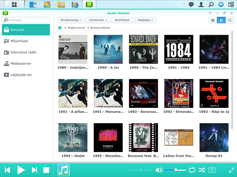 - Audio Station (AAC, M4A, MP3, Ogg Vorbis, WMA, M3U, WPL, SHOUTcast, Radioio) ? a külön kapható távvezérlő és USB-s hangszórók segítségével ezen formátumok, és az ezekben sugárzó webrádiók lejátszhatóak a NAS-sal, mint egy egyszerűbb zenelejátszóval. Webböngészőn kereszül érhető el az Audio Station felülete, ahol meghallgathatjuk a zenéket, lejátszási listákat készíthetünk, webrádiókat vehetünk fel a listába. Ha van távvezérlőnk is, akkor a webböngésző nélkül is elérhetjük a playlist-eket. Ha iPod-ot csatlakoztatunk a NAS USB-bemenetére, közvetlenül arról is elérhetőek a zenéink. DLNA Media Renderer és AirPlay lejátszókra is streamelhető ? akár szinkronban is ? a zene a NAS-ról akár a DS Audio mobil alkalmazással, mint távvezérlővel.